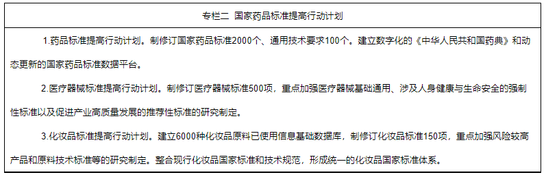 1.持續(xù)推進標(biāo)準(zhǔn)體系建設(shè)。繼續(xù)開展國家藥品標(biāo)準(zhǔn)提高行動計劃。編制2025年版《中華人民共和國藥典》。加強標(biāo)準(zhǔn)的國際協(xié)調(diào),牽頭中藥國際標(biāo)準(zhǔn)制定,化學(xué)藥品標(biāo)準(zhǔn)達到國際先進水平,生物制品標(biāo)準(zhǔn)與國際水平保持同步,藥用輔料和藥包材標(biāo)準(zhǔn)緊跟國際標(biāo)準(zhǔn)。加強藥品標(biāo)準(zhǔn)技術(shù)支撐體系建設(shè),提升藥品標(biāo)準(zhǔn)研究能力。優(yōu)化醫(yī)療器械標(biāo)準(zhǔn)體系,鼓勵新興技術(shù)領(lǐng)域推薦性標(biāo)準(zhǔn)制定,加快與國際標(biāo)準(zhǔn)同步立項,提升國內(nèi)外標(biāo)準(zhǔn)一致性。完善化妝品標(biāo)準(zhǔn)技術(shù)支撐體系,健全標(biāo)準(zhǔn)制修訂工作機制。