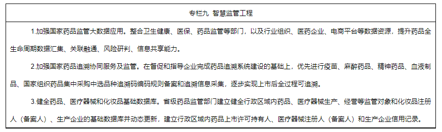 1.建立健全藥品信息化追溯體系。落實藥品上市許可持有人追溯主體責(zé)任。完善藥品信息化追溯體系,構(gòu)建國家藥品追溯協(xié)同服務(wù)和監(jiān)管體系,推進藥品追溯信息互通共享,實現(xiàn)重點類別藥品全過程來源可溯、去向可追。逐步實施醫(yī)療器械唯一標(biāo)識,完善醫(yī)療器械唯一標(biāo)識數(shù)據(jù)庫,加強在上市后監(jiān)管、醫(yī)療管理、醫(yī)保管理等領(lǐng)域的銜接應(yīng)用。